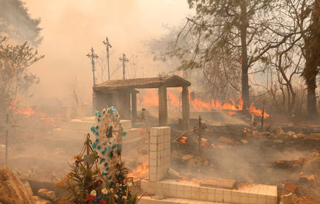 ▲ Los siniestros han afectado, hasta el momento, 125 hectáreas en montañas y zonas rurales del estado. El gobernador Cuitláhuac García informó que más de 500 integrantes de bomberos, GN, Ejército, Pemex y agrupaciones estatales combatían el fuego. Los incendios forestales están activos en los municipios de Maltrata, Nogales, Huiloapan, Soledad Atzompa, Texhuacan y Minatitlán. En esta última localidad, las llamas ardían cerca de la refinería Lázaro Cárdenas. En la imagen, cementerio en Nogales. Foto Iván Sánchez. Corresponsales