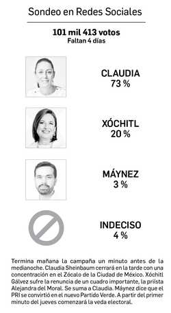 n las elecciones presidenciales de 2018 el candidato del PAN, Ricardo Anaya, quedó en segundo lugar en Jalisco, un peldaño debajo de AMLO. El tercero lo ocupó el priísta José Antonio Meade. Seis años después, su compañera prianista, Xóchitl Gálvez, quedará, como Meade, en tercer lugar, dos lugares debajo de Claudia Sheinbaum y Jorge Álvarez Máynez, de acuerdo con la encuesta de Reforma, uno de los medios que ha venido apoyándola. Hace seis años concurrieron a las urnas aproximadamente 3 millones de tapatíos. El panista prófugo que volverá a México con una charola de senador, y fuero, ganó el 33 por ciento de la votación que representó 1 millón 179 mil sufragios. En cambio, Xóchitl obtendría sólo 19 por ciento, es decir, 570 mil, alrededor de 600 mil votos menos. Pero en estos seis años el padrón ha crecido, su pérdida podría rozar el millón. De acuerdo con la encuesta, Claudia tendría 56 por ciento y Máynez el 25 por ciento. (Además, perdió el Cruz Azul).