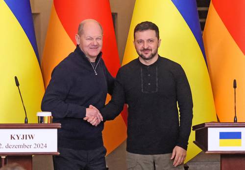 El canciller federal alemán, Olaf Scholz, reiteró ayer que Alemania suministrará más sistemas de defensa antiaérea a Ucrania el próximo año, al reunirse en la catedral de Santa Sofía, en Kiev, con el mandatario ucranio, Volodymir Zelensky (ambos en la imagen), quien evidenció las diferencias que le separan con el jefe de gobierno alemán debido a que éste mantiene su rechazo a proporcionarle misiles de largo alcance Taurus en su guerra contra Rusia.