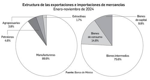 De ese monto, 49 mil 643 millones de dólares correspondieron a exportaciones no petroleras y 2 mil 382 millones de dólares a petroleras. En el periodo de referencia, las exportaciones totales observaron un aumento de 3.7 por ciento frente a noviembre de 2023, resultado de un incremento de 4 por ciento en las exportaciones no petroleras y una caída de 2.7 por ciento en las petroleras.