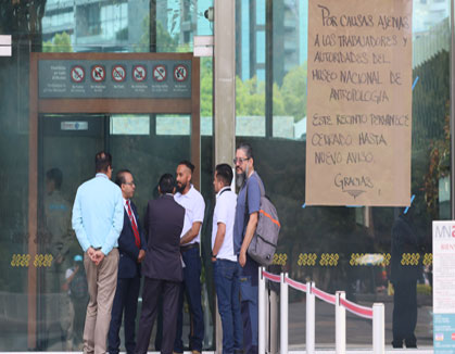 ◀  En Antropología apareció un cartel escrito a mano en el que se deslinda a trabajadores y autoridades del recinto. Foto Luis Castillo