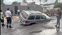 ▲ Un automóvil cayó en un socavón, luego de una tormenta en la colonia Bonfil del municipio de Villa de Álvarez, Colima.