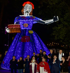 ▲ Como parte del comienzo de las celebraciones por el Día de Muertos, la jefa de Gobierno capitalino, Clara Brugada, inauguró sobre Paseo de la Reforma el Festival Lumínico, en el que se pueden apreciar 14 piezas con diferentes figuras, entre ellas una Catrina monumental. Foto Roberto García Ortiz / Mara X. Pérez