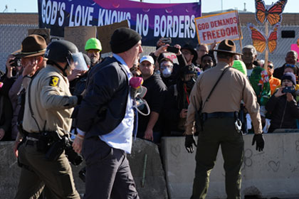▲ Policías del estado de Illinois arremetieron contra líderes religiosos en Chicago durante una protesta contra la ofensiva antimigrante de la administración de Donald Trump, la cual se llevó a cabo frente al centro de detención del Servicio de Inmigración y Control de Aduanas. Congresistas demócratas denunciaron que los agentes respondieron a la oración de un pastor disparándole directamente en la cara bolas de pimienta, dispositivos rellenos de agentes químicos, perdigones o fragmentos de goma. En la imagen, arresto de uno de los manifestantes. Foto Ap / Agencias