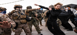 ▲ En los barrios, los vecinos se organizan para alertar con silbidos sobre las redadas. También con marchas, vigilias, paros y protestas expresan el rechazo a la política migratoria del gobierno de Trump. En la imagen, un agente federal repele con gas al reverendo David Black, afuera de un centro del ICE en Chicago. Foto Ap. D. Brooks y J. Cason, Corresponsales