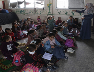 ▲ Entre continuos ataques israelíes en la franja aun con el alto el fuego, niños palestinos, muchos de ellos pertenecientes a familias desplazadas, asisten a clase en la escuela de la misión de la ONU, en el centro de Gaza. Personas que viven en el plantel evacuan cada mañana a fin de que se puedan usar las aulas para la enseñanza. Foto Afp Agencias