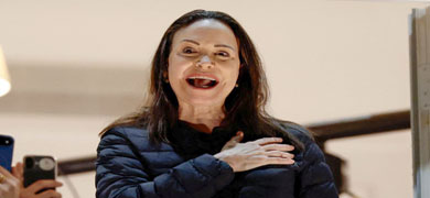 ▲ La Nobel de la Paz llegó ayer a Noruega horas más tarde de que su hija recibiera el galardón a su nombre durante la ceremonia oficial. Desde un balcón del Grand Hotel de Oslo cantó el himno nacional venezolano ante sus seguidores. Foto Afp