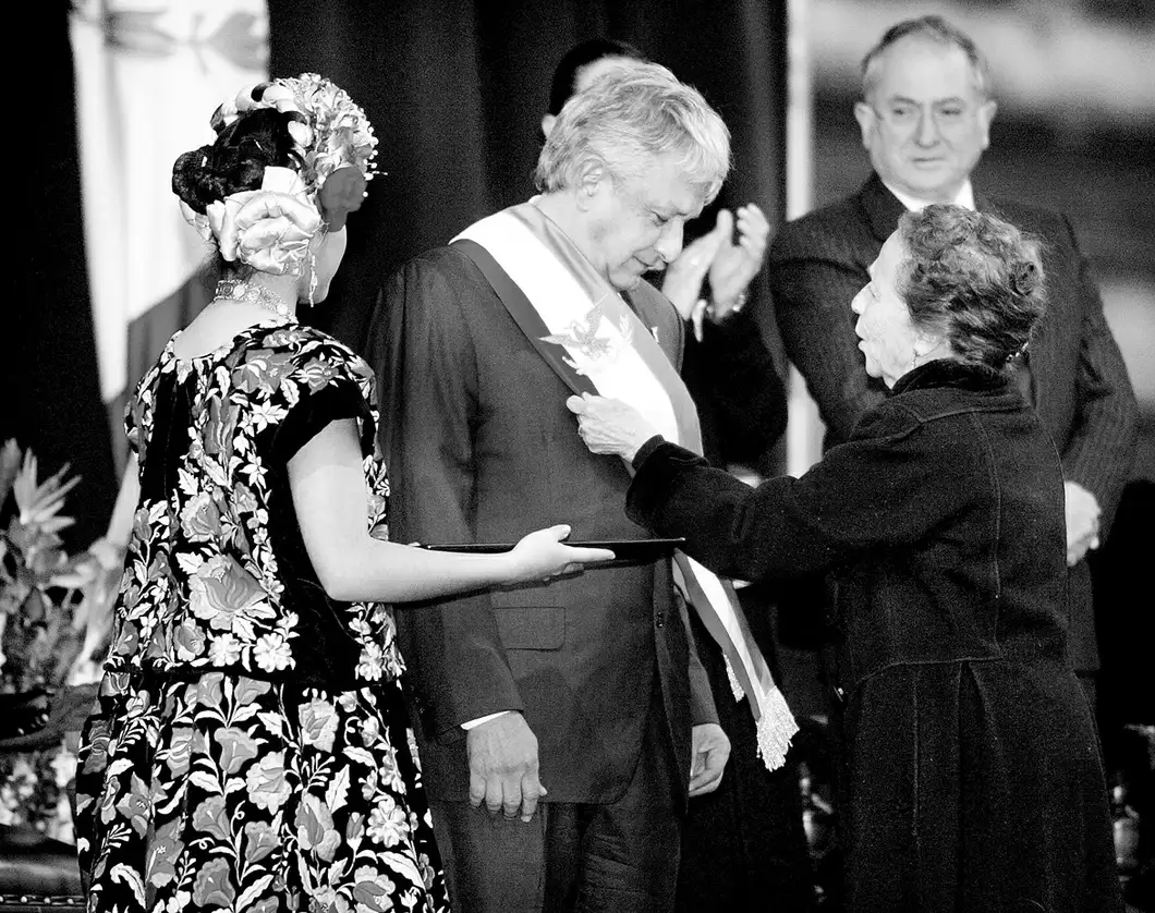 Rosario Ibarra de Piedra coloca la banda presidencial a Andrés Manuel López Obrador en el Zocalo capitalino, durante su nombramiento como 'presidente legítimo', el 20 de noviembre de 2006. Foto Carlos Ramos Mamahua