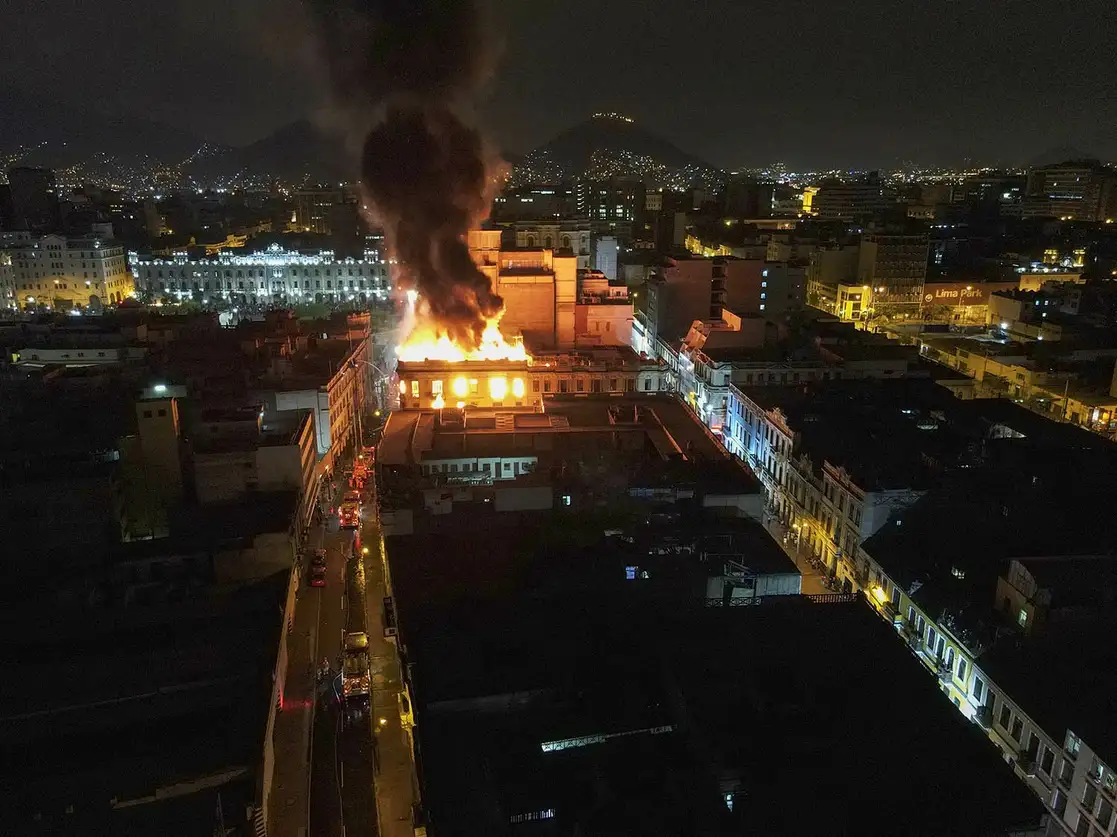 Por la noche, un edificio cerca de la zona de las manifestaciones se incendió y los bomberos intentaban apagar el fuego que se extendía varios metros hacia el cielo. No estaba claro si tenía alguna relación con las protestas y no hubo reportes de ningún herido. Foto: Ap/ Martín Mejía