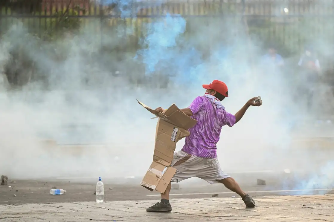 Algunos de los manifestantes lanzaron piedras a los policías, que respondieron con bombas lacrimógenas. Las autoridades también desalojaron a varias personas que se encontraban en un parque aledaño.Foto: Afp/ Ernesto Benavides