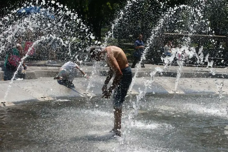 Ciudad de México. Un joven se refresca en una fuente, en calles del Centro Histórico. Foto La Jornada / José Antonio López