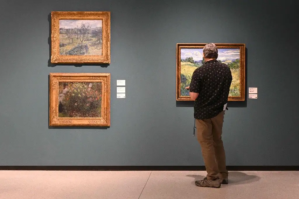 Praga. Un visitante observa una pintura de Vincent van Gogh (der.) junto a pinturas de Claude Monet y Camille Pissarro (arriba a la izquierda) en la Galería Nacional de la capital de República Checa. La colección, comprada hace cien años gracias a importantes políticos del país, como el presidente Tomas Garrigue Masaryk, está compuesta por 44 pinturas, 25 estatuas, 22 dibujos y unas 170 obras de arte gráfico de diversos autores como Paul Cézanne, Paul Gauguin o Pablo Picasso. Foto Afp / Michal Cizek