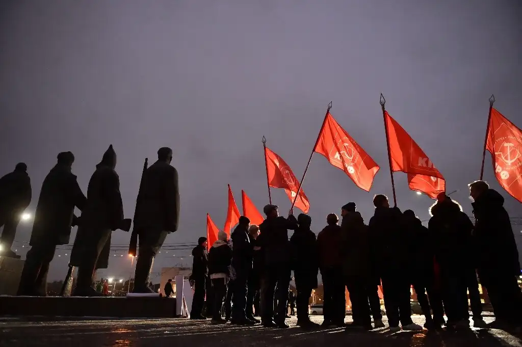Novosibirsk. Simpatizantes del Partido Comunista Ruso sostienen banderas durante una manifestación para conmemorar el 106º aniversario de la Revolución Bolchevique de octubre de 1917, en esta ciudad siberiana. Foto Afp / Vladimir Nikolayev