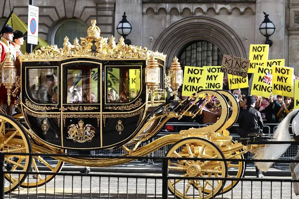 Londres. El rey Carlos III de Gran Bretaña y la reina consorte Camila viajan en el autocar estatal Diamond Jubilee junto a manifestantes que portan pancartas con la leyenda "No es mi rey", del grupo antimonárquico Republic, previo a la apertura estatal del Parlamento, en la capital inglesa. Foto Afp / Henry Nicholls