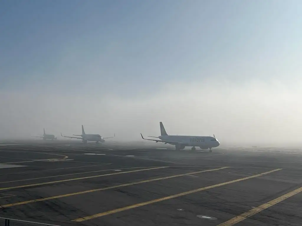 Ciudad de México. Esta mañana fueron suspendidos por más de dos horas los vuelos en el Aeropuerto Internacional de la Ciudad de México (AICM) por un banco de niebla. Poco antes de las 9 AM anunciaron que los despegues se habían reanudado. Foto La Jornada / Alfredo Domínguez