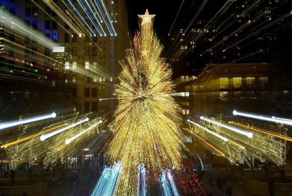 Chicago. Los turistas pasan junto al Árbol de Navidad instalado en Millennium Park en una exposición cronometrada con una lente zoom. Foto Ap / Charles Rex Arbogast