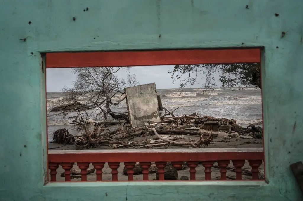 El Bosque. Una ventana enmarca una parte de la costa llena de escombros arrastrados por las inundaciones, generadas por el aumento del nivel del mar en el Golfo de México, en esta comunidad costera ubicada en el estado de Tabasco. Foto Ap / Félix Márquez