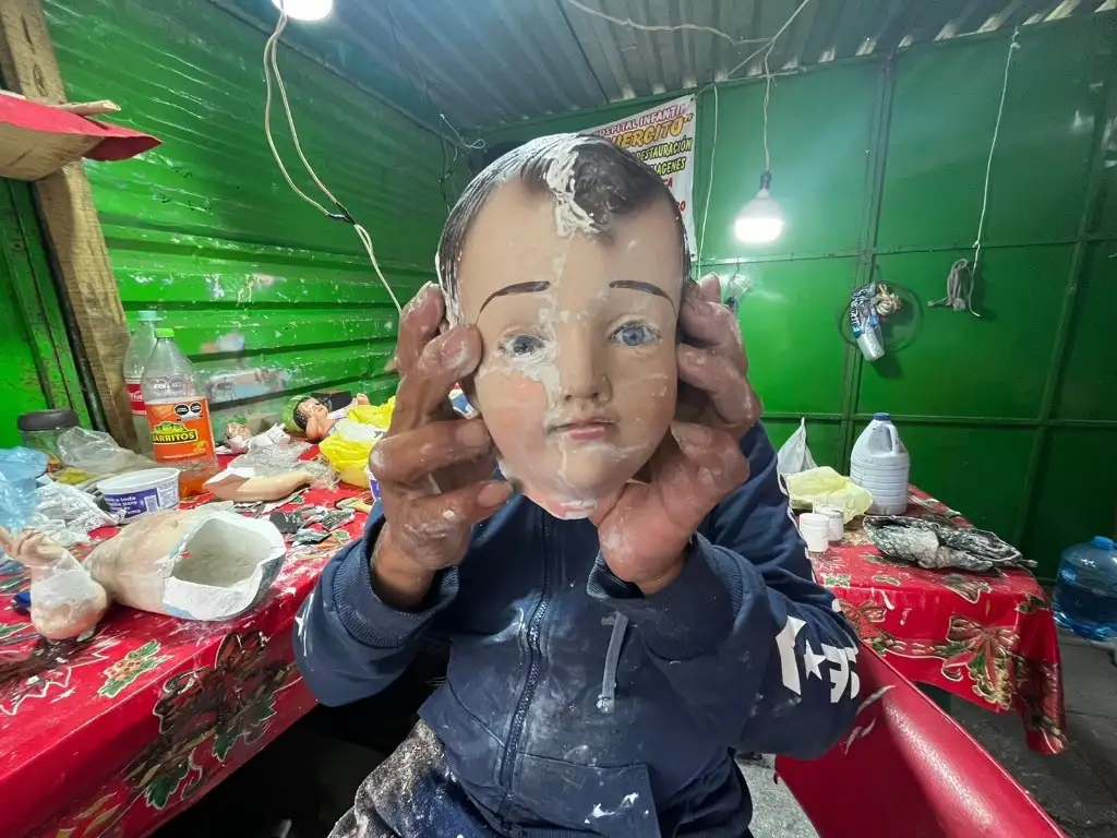 Ciudad de México. Figuras de yeso del Niño Dios son reparadas en un 'hospital' que se encarga de la restauración de estas imágenes religiosas que resultaron dañadas durante la celebración de la Nochebuena. Estos 'nosocomios' se encuentran en explanada de la alcaldía Xochimilco. Foto Luis Castillo
