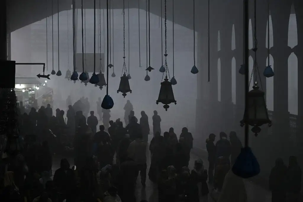Lahore. Pasajeros esperan para abordar sus vagones en la estación de tren de la capital pakistaní, en medio de una densa niebla. Foto Afp / Arif Ali