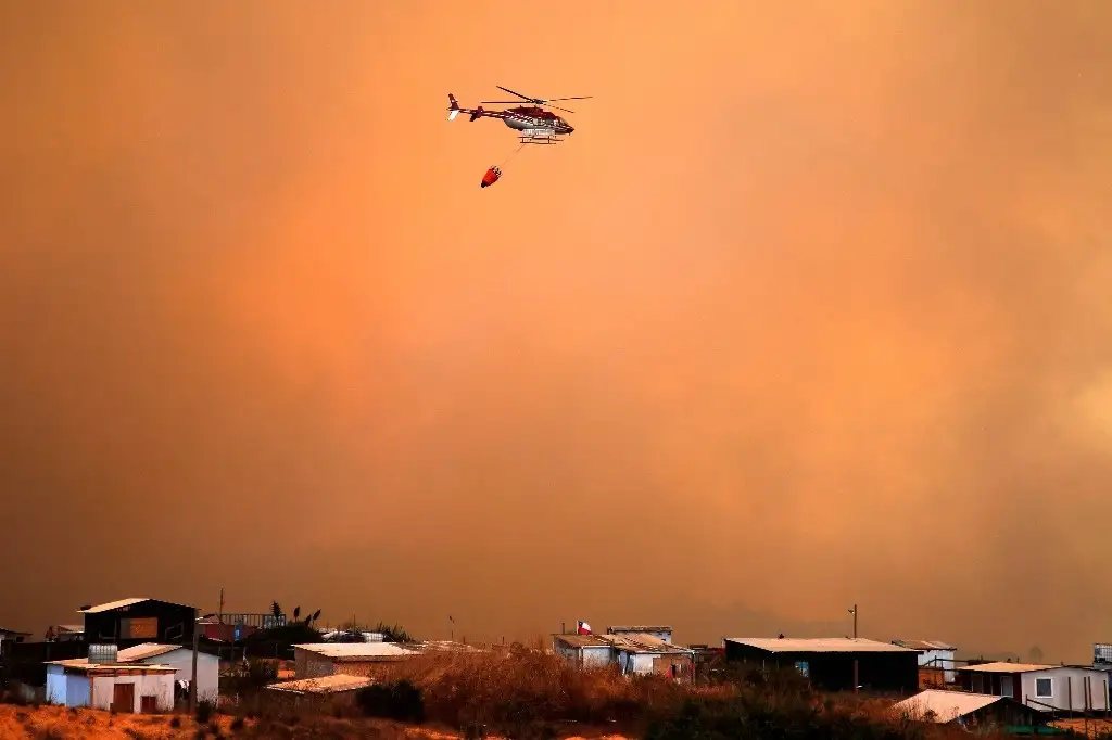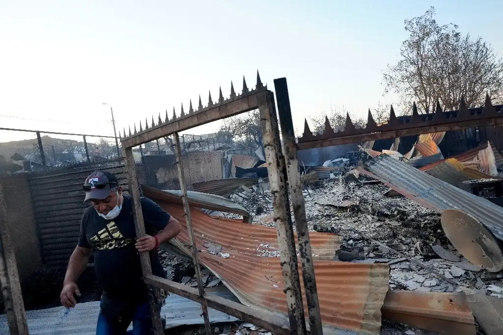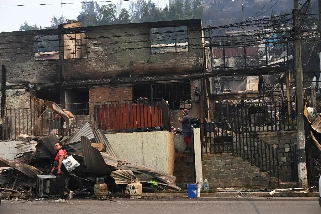 Viña del Mar, Chile. 3 de febrero de 2024. Caminando entre el humo, miles de personas volvieron a sus casas destruidas por los "incendios sin precedentes" que dejan hasta ahora 19 muertos y mantienen este sábado en emergencia a Viña del Mar, Valparaíso y otras regiones del centro y sur de Chile. Apoyados por helicópteros y aviones, bomberos y voluntarios luchan contra las llamas en los cerros de varios puntos del país, sometidos a las altas temperaturas en pleno verano austral.