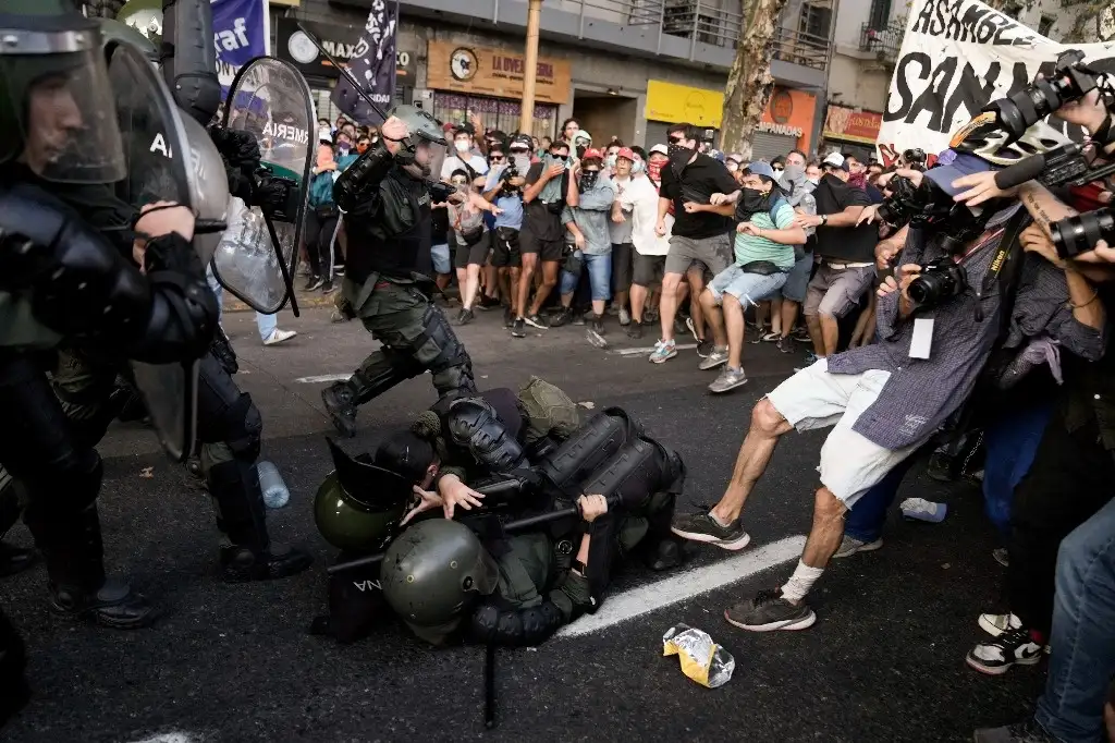 Buenos Aires, Argentina. 3 de febrero de 2024. Las tensiones en las calles cercanas al Congreso de Argentina van en aumento tras la aprobación parcial de la ley 'ómnibus' presentada por el Gobierno de Milei, en las que se ven quemas de contenedores, el uso de gases lacrimógenos por parte de la Policía y un intento de ataque a un diputado. Hasta el momento siete personas fueron detenidas.