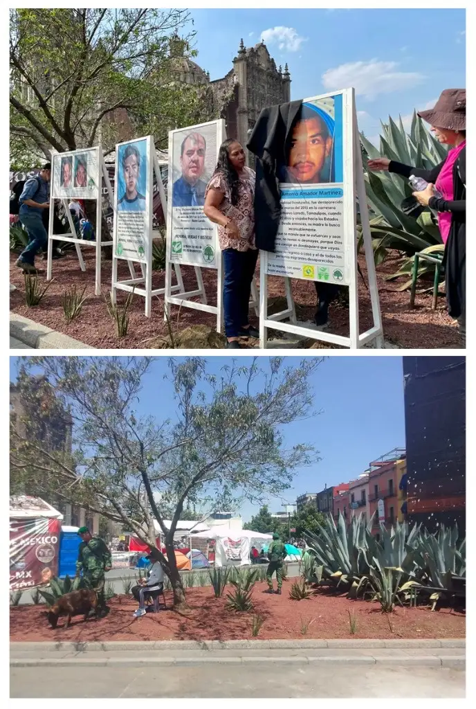 Ciudad de México. Colectivos denuncian la remoción de cuatro memoriales en honor a personas desaparecidas instalados frente a Palacio Nacional durante 2024. Exigen al gobierno federal ofrezca disculpas por los hechos, devuelva los memoriales a las familias y brinden las facilidades para su reinstalación en el espacio público. La imagen de arriba es del 13 de marzo pasado, durante la instalación de la imagen de Marco Antonio Amador Martínez; la segunda el día de hoy. Fotos: Roberto García Ortiz y Fermín González