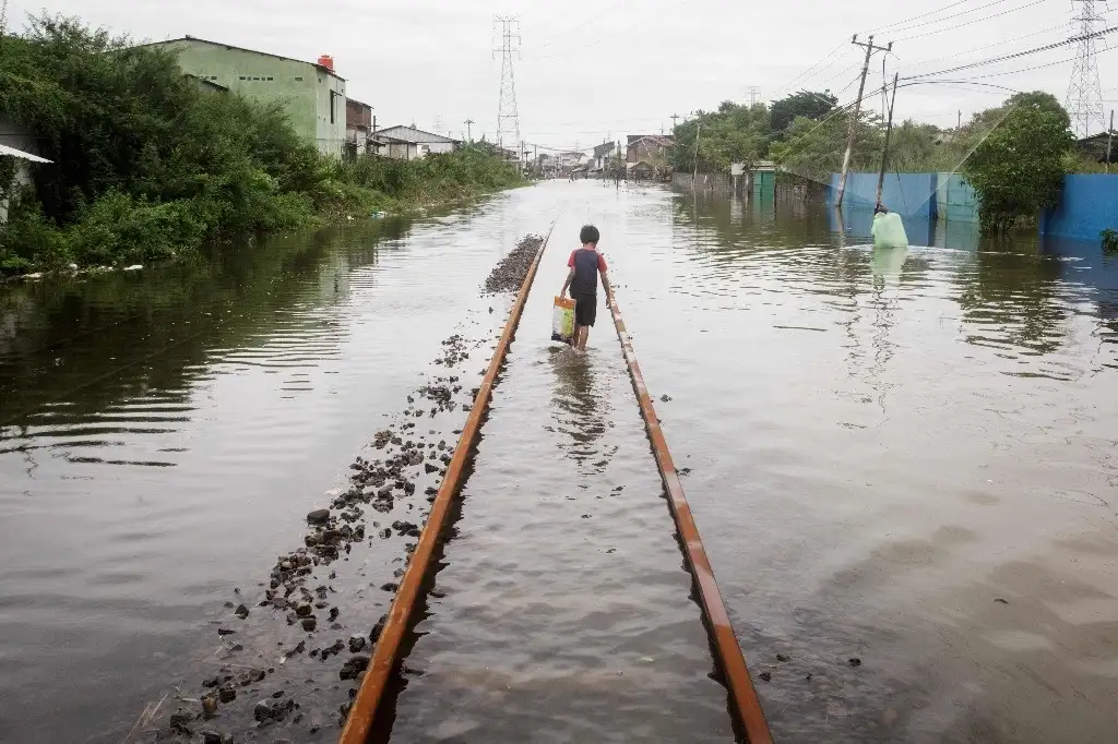 Semarang. Un niño camina sobre esta zona inundada después de las fuertes lluvias en esta ciudad indonesa. Foto Afp / Devi Rahman