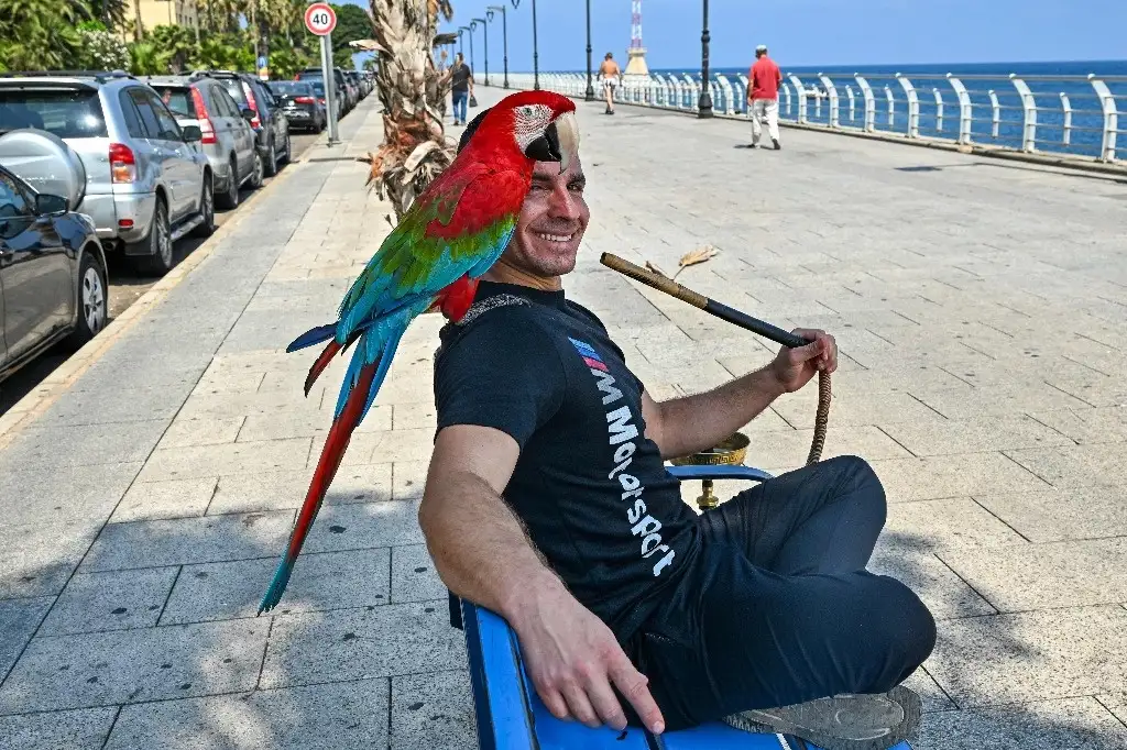 Beirut. Un hombre fuma una pipa de agua sentado en un banco con su loro, en la capital libanesa. Foto Afp / Joseph Eid