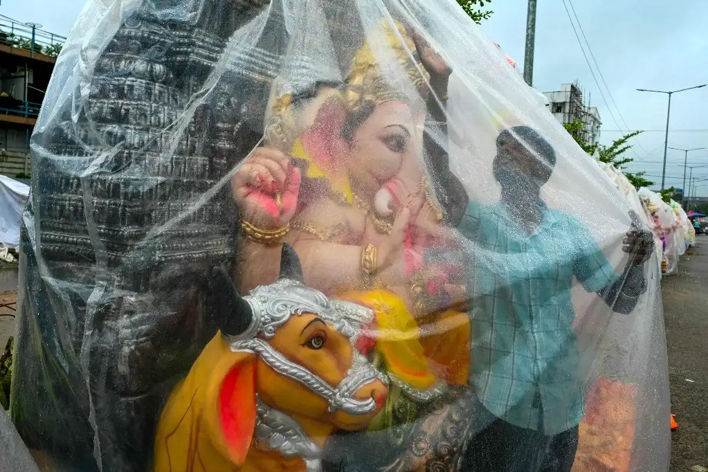 Hyderabad. Un vendedor envuelve un ídolo de la deidad hindú Ganesha a lo largo de una calle antes del festival Ganesh Chaturthi, en esta ciudad de la India. Foto Afp / Noah Seelam
