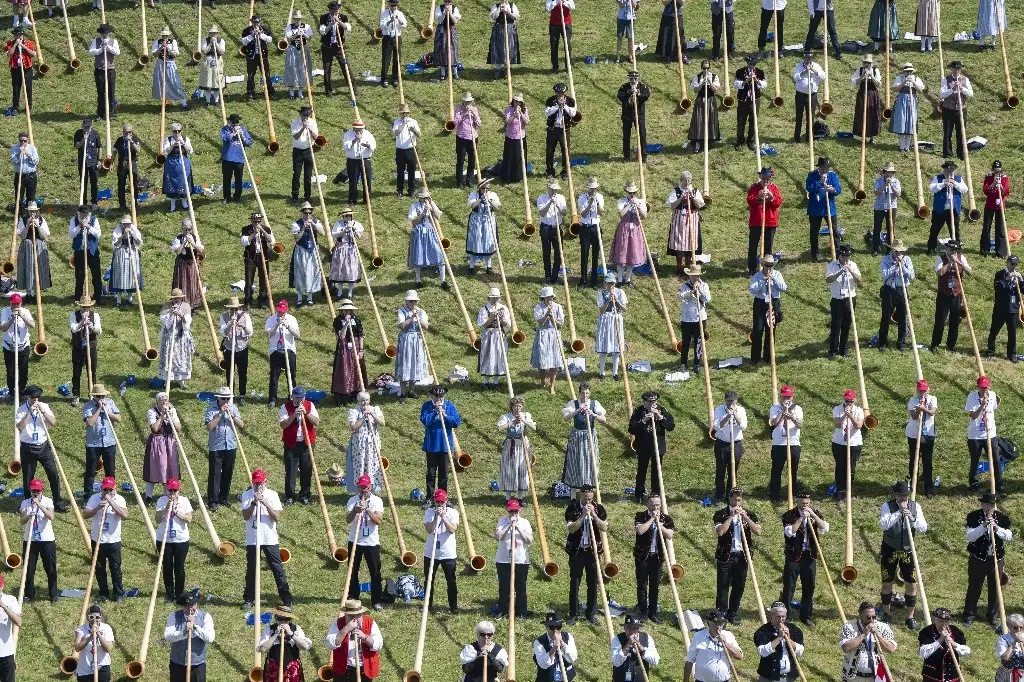 Nidwalden. Los músicos de trompa alpina se alinean en la zona con motivo de un intento de récord mundial de este instrumento con más de mil músicos en el Festival Klewenalp, en este cantón de Suiza. Foto vía Ap