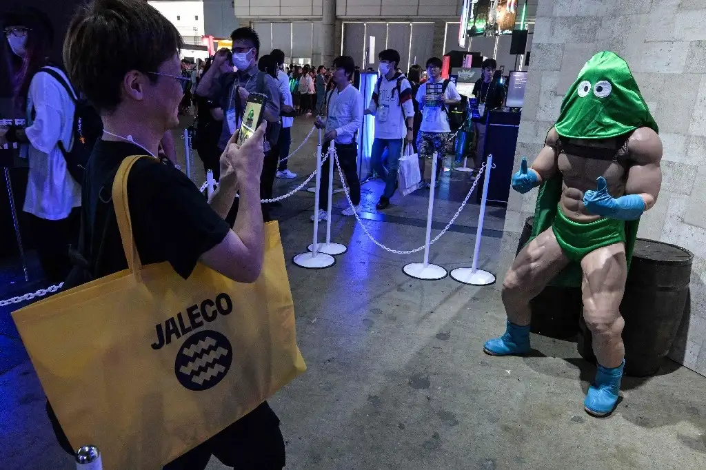 Chiba. Un visitante toma una fotografía de un hombre disfrazado afuera del stand del videojuego 'Dragon Quest', durante el día de vista previa del Tokyo Game Show anual en Makuhari Messe, en esta ciudad japonesa. Foto Afp / Richard A. Brooks