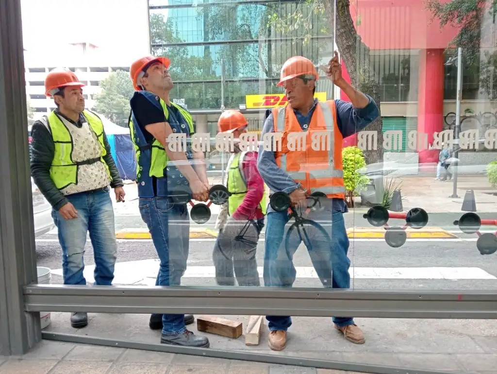 Ciudad de México, Trabajadores retiran los cristales de una estación del Metrobús sobre Paseo de la Reforma, en previsión de la marcha por el décimo aniversario de la desaparición de los 43 normalistas de Ayotzinapa. Foto José Antonio López