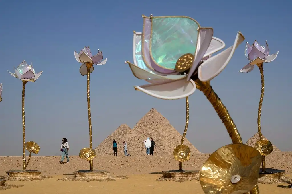 El Cairo. Visitantes caminan junto a la obra 'Padma/Pulse and Bloom', del artista indio Shilo Shiv Suleman, durante la exposición de arte contemporáneo "Forever Is Now" en el sitio histórico de las pirámides de Giza, en las afueras de la capital egipcia. Foto Ap / Amr Nabil