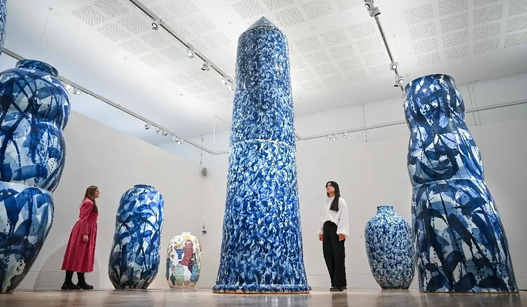 Londres. Un par de visitantes observan jarrones gigantes y creaciones de cerámica que forman parte de la instalación de arte "Un bosque de porcelana", de la ceramista británica Felicity Aylieff, durante una sesión fotográfica para la exposición "Expressions in Blue: Monumental Porcelain" en Kew Gardens, en la capital inglesa. La muestra estará abierta del 26 de octubre de 2024 al 23 de marzo de 2025. Foto Afp / Justin Tallis
