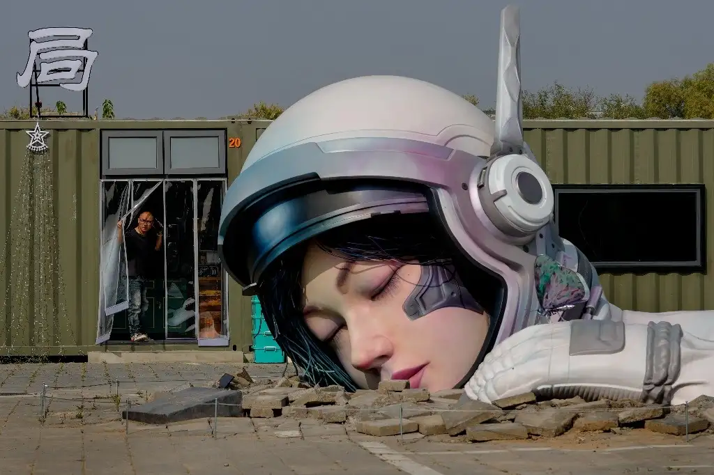 Pekín. Un hombre mira desde un restaurante contenedor cerca de una escultura de arte que representa a una astronauta durmiente en el distrito artístico de Songzhuang, en el este de la capital china. Foto Ap / Andy Wong