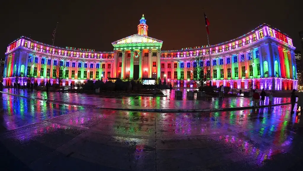 Denver. La exhibición anual de luces navideñas ilumina el edificio de la ciudad/condado, visto a través de una lente de ojo de pez, en el centro de la capital de Colorado, Estados Unidos. Foto Ap / David Zalubowski