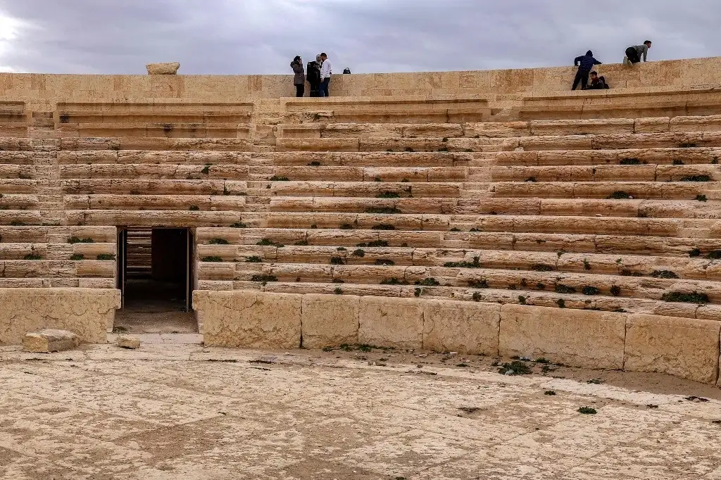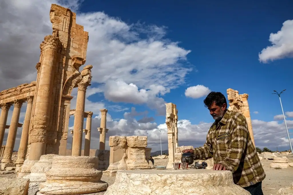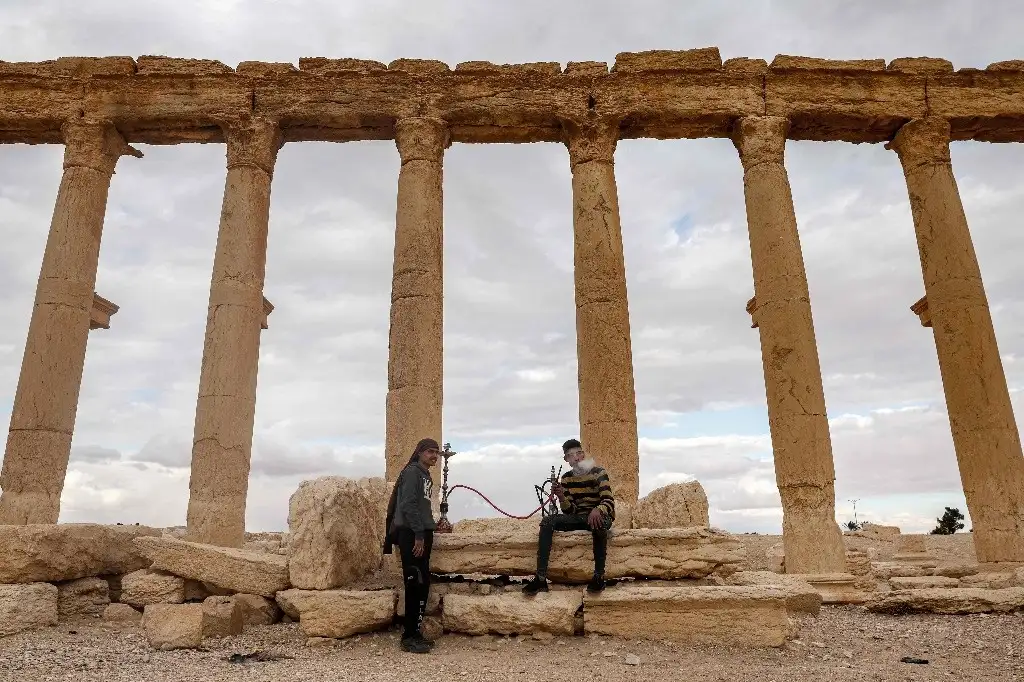 Palmira, Siria. 13 de febrero de 2025. Después de años alejados de sus impresionantes ruinas grecorromanas, y pese a las cicatrices de la guerra en Siria, los habitantes de Palmira han regresado a la "Perla del desierto" para pasear entre sus monumentos, beber té y fumar narguilé.