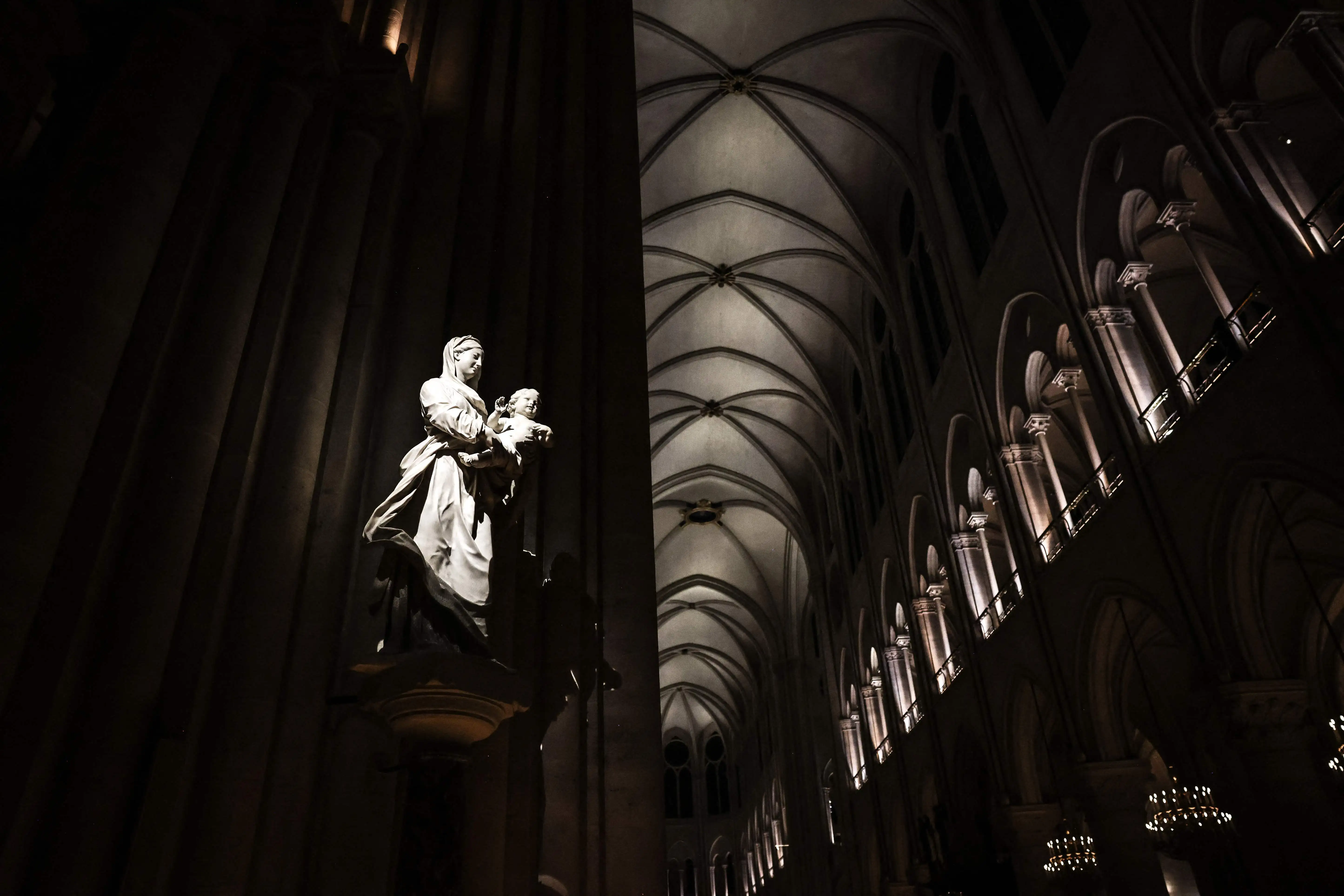 París. La estatua de la Virgen de los Estudiantes en la catedral de Notre-Dame, con su nuevo esquema de iluminación, en la capital francesa. Foto Afp / Thibaud Moritz Foto Afp / Thibaud Moritz