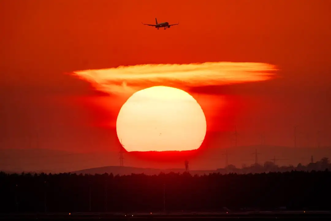 Frankfurt. Un avión se acerca al aeropuerto de esta ciudad alemana, mientras el sol se pone. Foto Ap / Michael Probst