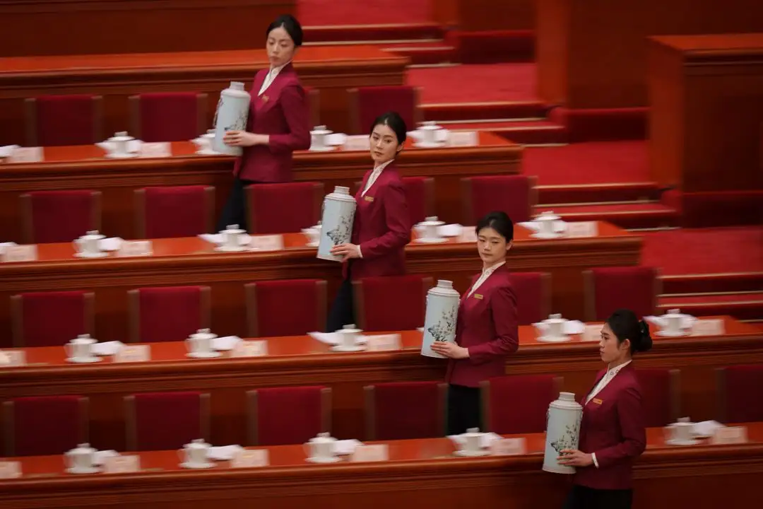 Pekín. Las anfitrionas preparan té para los delegados antes del inicio de la sesión plenaria del Congreso Nacional Popular (CNP) en el Gran Salón del Pueblo en la capital china. Foto Ap / Vincent Thian