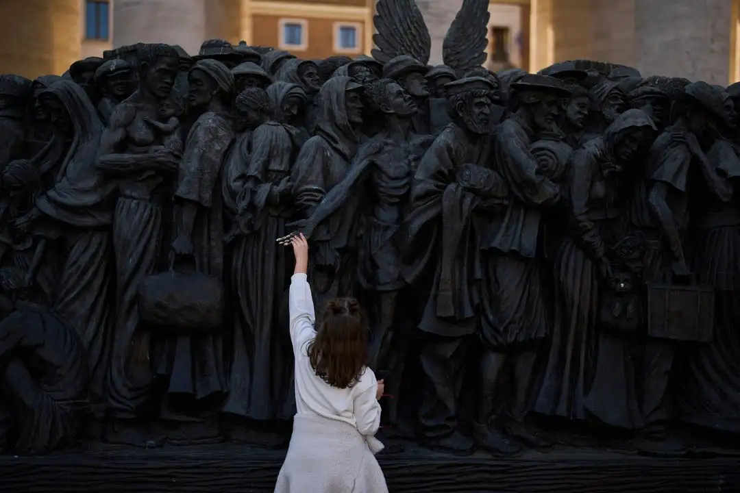 Roma. Una niña toca la escultura de un barco “Ángeles inconscientes” del artista canadiense Timothy P. Schmalz, ubicada en la Plaza de San Pedro, en la capital italiana. Foto Ap / Francisco Seco