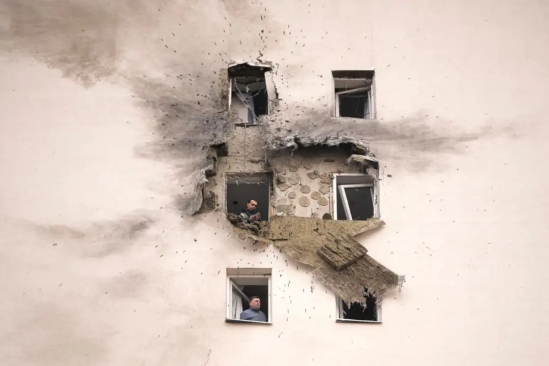 Sapronovo. Investigadores observan los daños en un edificio de departamentos donde cayó el dron ucranio en esta aldea, ubicada a las afueras de Moscú, capital rusa. Foto Ap