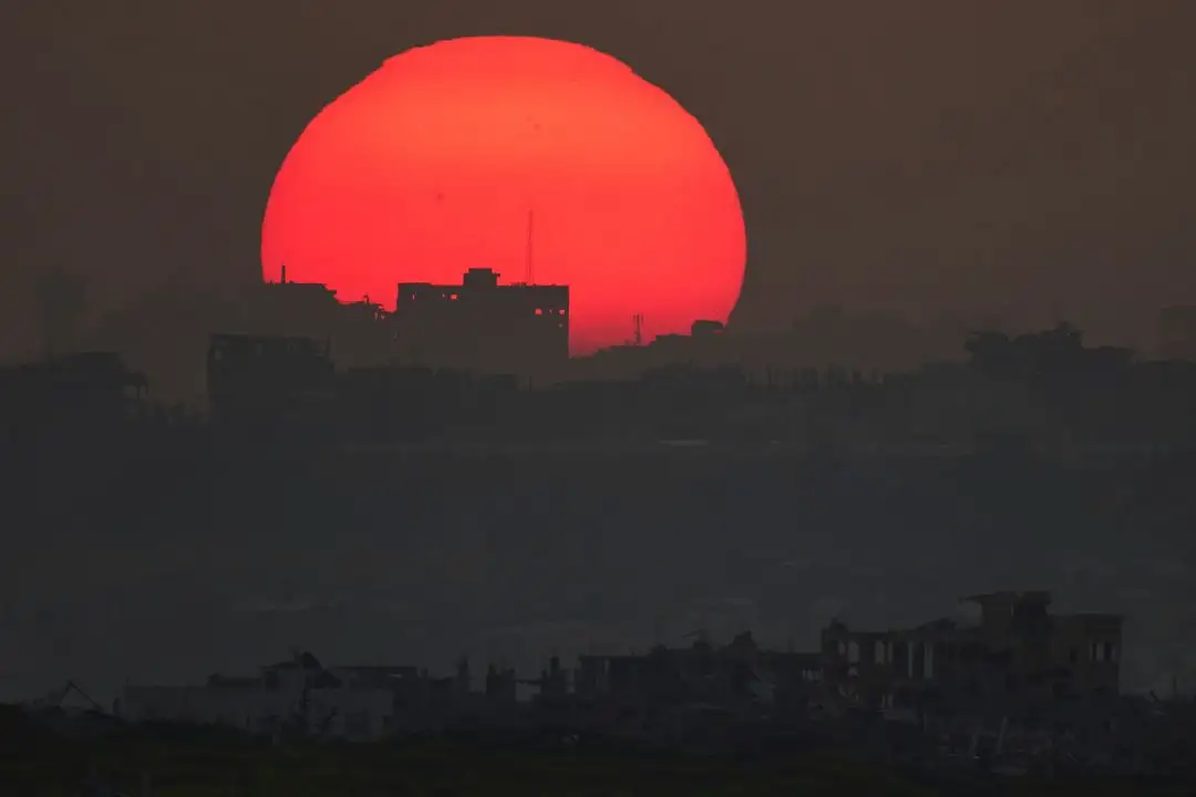 Gaza. El sol se pone detrás de los edificios que fueron destruidos durante la ofensiva aérea y terrestre israelí en la Franja de Gaza, vista desde Israel. Foto Ap / Leo Correa