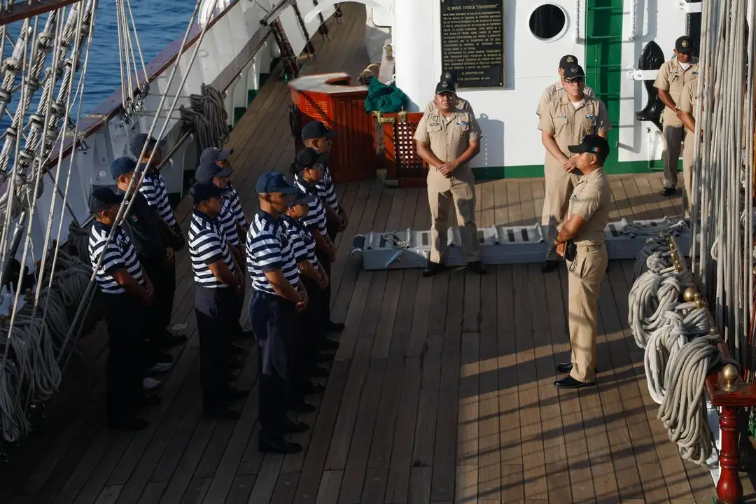Acapulco, Guerrero. 11 de marzo de 2025. El Buque Escuela Cuauhtémoc, un velero con más de cuatro décadas de servicio en la Secretaría de Marina Armada de México, es un símbolo de las tradiciones marineras y un embajador de la cultura mexicana en los mares del mundo. A bordo, la vida transcurre con disciplina y dedicación, donde cada miembro de la tripulación, compuesta por 261 personas, desempeña un papel crucial en el funcionamiento del barco. Desde las guardias de vigilancia de cuatro horas hasta las faenas diarias de limpieza, mantenimiento y navegación, todos contribuyen al éxito de la misión.
