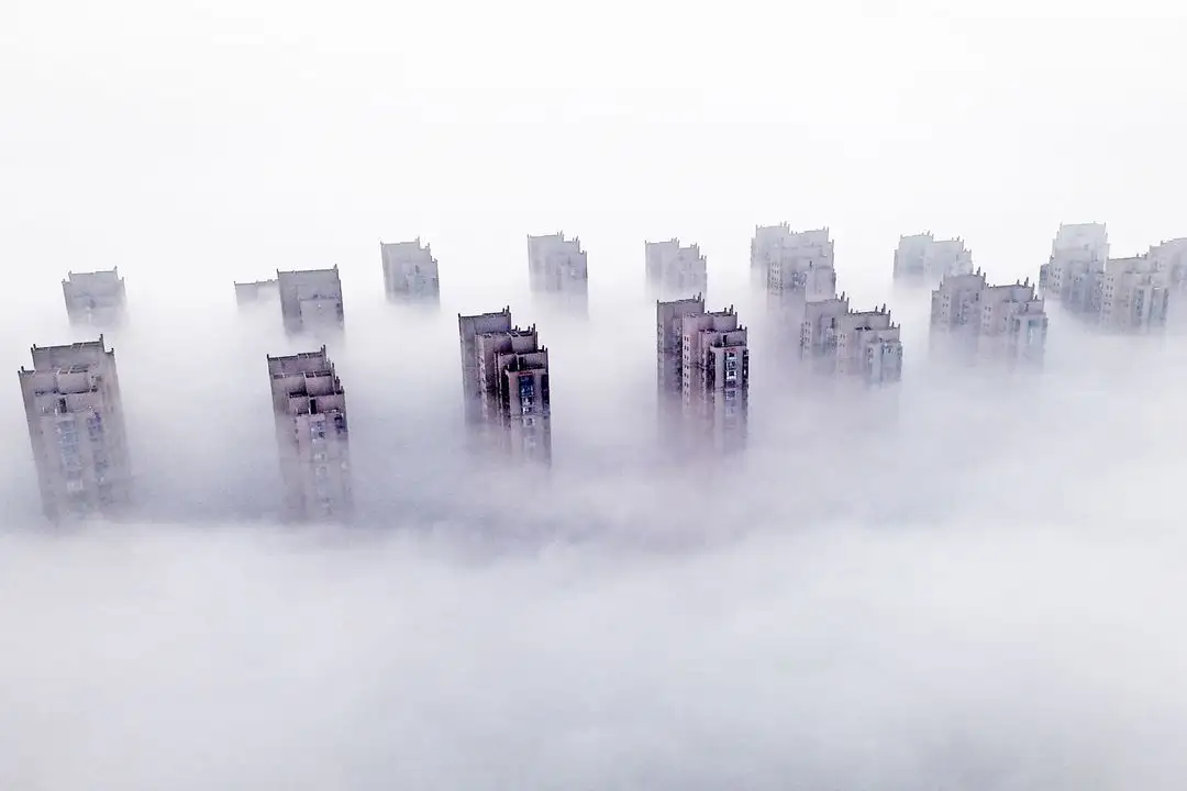 Lianyungang. Vista aérea de edificios residenciales envueltos en niebla en esta ciudad, de la provincia oriental china de Jiangsu. Foto Afp / China OUT