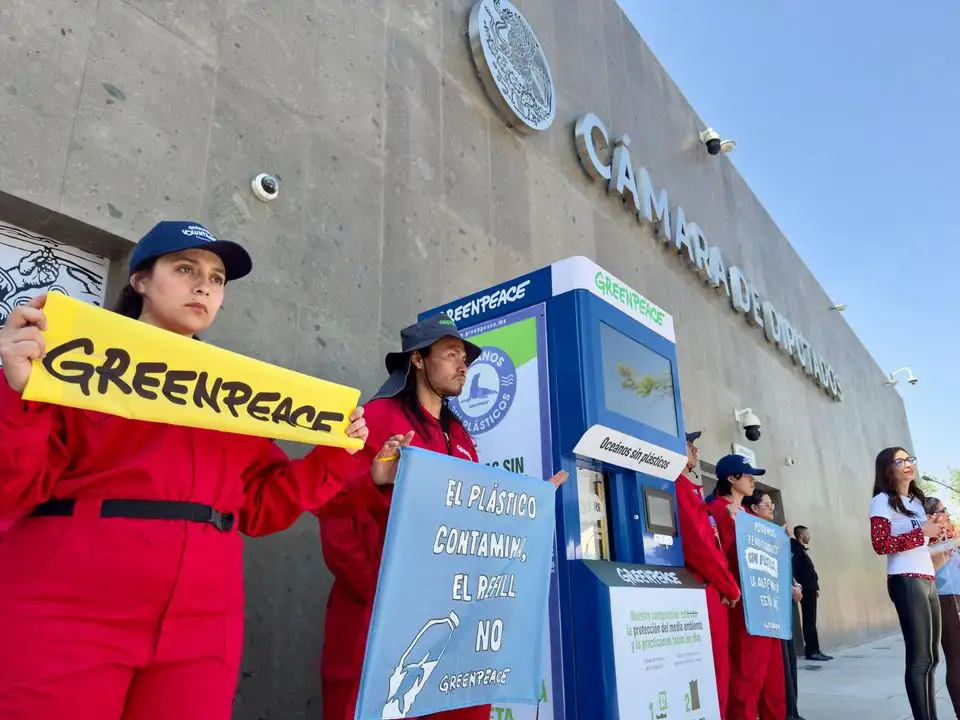 Ciudad de México. Integrantes de Greenpeace México realizan una actividad de refill, al exterior de la Cámara de Diputados, con el fin de demostrar a los legisladores que existen alternativas a los envases y empaques plásticos, además de pedir así una reforma a la Ley General de Residuos (LGPGIR) que ponga fin a la contaminación por plásticos desde su raíz. Foto Roberto García Ortiz