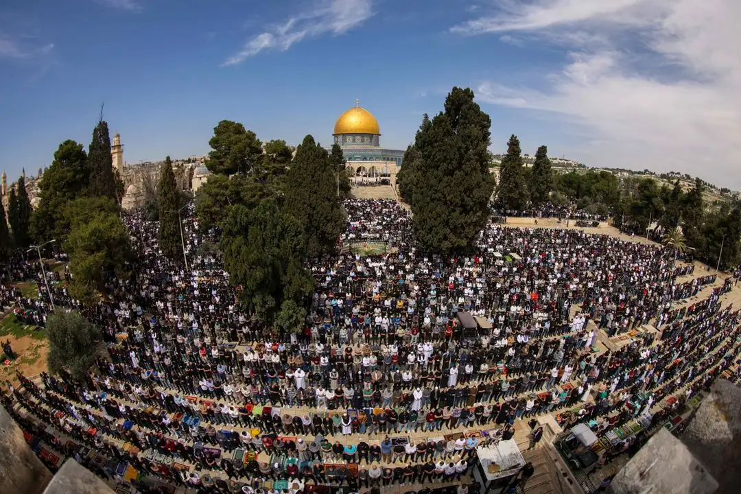 Jerusalén. Fieles musulmanes rezan cerca de la Cúpula de la Roca en el recinto de la Mezquita de Al-Aqsa, en la capital israelí, durante la oración del mediodía del segundo viernes del mes sagrado de ayuno del Ramadán. Foto Ahmad Gharabli / Afp