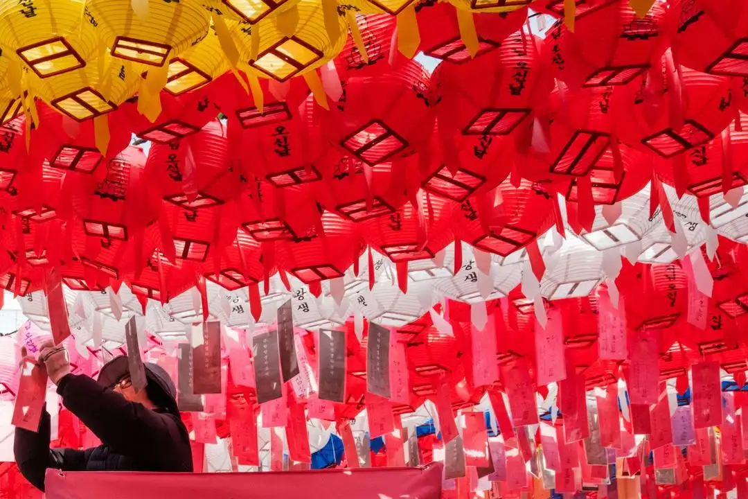 Seúl. Un hombre ata una tarjeta de deseos a uno de los faroles que cuelgan sobre el terreno del Templo Jogyesa, antes del Festival de los Faroles de Loto en mayo, que celebra el cumpleaños de Buda, en la capital surcoreana. Foto Afp / Yasuyoshi Chiba