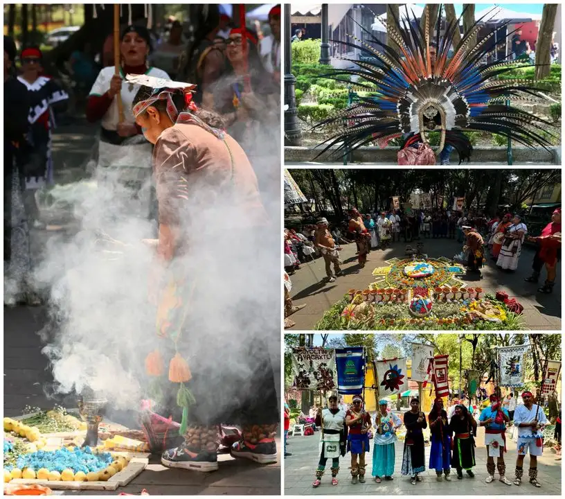Ciudad de México. Ceremonia del nacimiento de un nuevo grupo de danzantes que se conocerá como ‘Xiuhquiauitl’, que significa ‘lluvia de fuego turquesa’. La celebración se realizará durante todo el domingo con danzas y cantos prehispánicos en el centro de la alcaldía Coyoacán. Foto Luis Castillo
