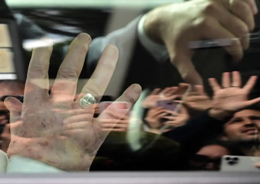 Roma. La gente se refleja en la ventana del coche mientras el Papa Francisco sale del hospital Gemelli tras cinco semanas de hospitalización por neumonía en la capital italiana. El Sumo Pontífice regresará a su residencia en el Vaticano, donde pasará “al menos dos meses” de recuperación, anunció uno de sus médicos durante una rueda de prensa el sábado. Foto Afp / Tiziana Fabi